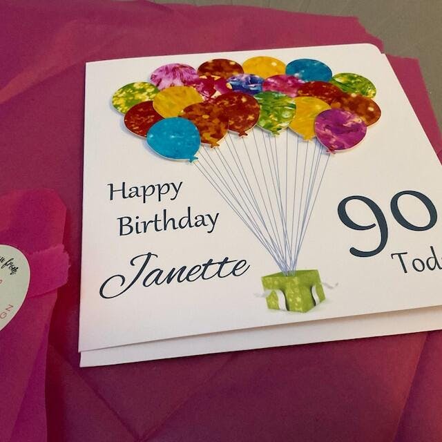 Wonderfully colourful 90th birthday card, beautifully handmade and personalised with the name of your choice, or Mum / Dad/ Grandma / Granda, etc. The choice is yours!